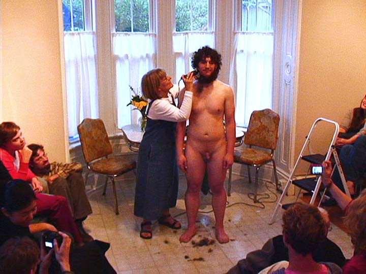 In 30th Birthday Shave, searching for a meaningful ceremonial rite of passage to mark the adult milestone referenced in the title, Noah stands nude in front of a staged kitchen table and chairs, in a room filled with people. He gives the audience a brief introduction: exactly nine months prior, he shaved off all of his body hair in preparation for this performance. His mess of curls and unruly beard, along with all (yes, all) of the other hair on his body is about to be shaved off by Noah’s mother, whose denim dress and Teva sandals amplify the supportive, maternal, and empathetic energy she’s obviously directing towards her son. The ensuing video is a document of that shave, both excruciatingly uncomfortable and incredibly endearing.
