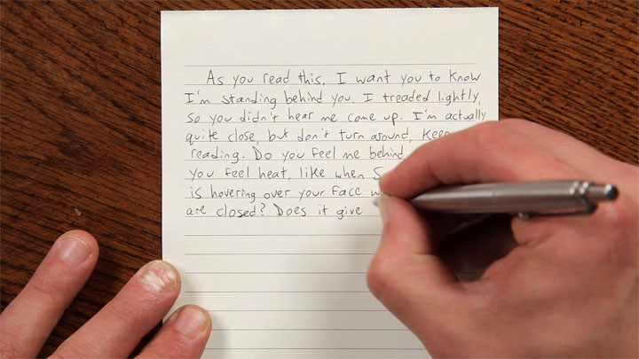 (Piggyback) and Shave describe relationships in which all characters involved are contained on screen. Noah and I talked about the direction of his newest work (not in the Haverford show), in which the relationships extend outwards, incorporating the viewer as a component. In “Our Proximity,” (2012) all we see of Krell is his hands, writing a letter to the viewer that describes an imagined real-time interaction in which the author eerily approaches and stands behind the viewer as s/he watches and reads. The letter asks how the situation makes the viewer feel, and concludes that one another’s presence will exist as an unspoken, shared occurrence.