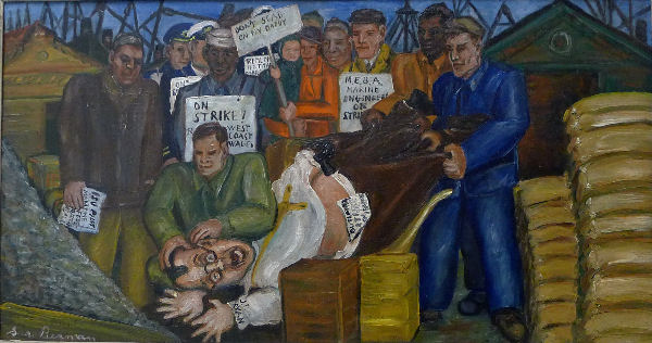 Sarah Berman Beach’s “Waterfront Strike” memorializes the West Coast Strike of 65,000 union longshoremen and other workers in San Francisco Bay in 1934, an event which is remembered as a failure and black eye for the unions of that era. Beach’s painting shows a crowd on the dock attacking J.P. Ryan – the leader elected to represent the dockworkers in negotiations and whose proposed settlement was rejected. A diverse crowd of dockworkers, including a mother and child, happily look on at the cartoonish Ryan figure’s (apparently fictional) beating. The distorted image seems to reflect Beach’s opinion of the confusion of workers in the labor movement of that era; satisfied with attacking their own leader, rather than their actual capitalist oppressors. Meanwhile, the machinery in the distant background and the stacked sacks of goods from overseas wall the workers in like animals in a cage. According to historical sources, the strike ended without the union’s demands being met, a loss in the war of wills which weakened their position for years to come.