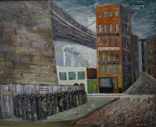 That era of history is brought vividly to life in “Jewish Artists in America: 1925-1945,” a showing of 21 paintings from the collection of Steven and Stephanie Wasser at the National Museum of American Jewish History in Old City. Not restricted to depictions of Jewish life, these paintings portray diverse subjects in the social realist style. The day-to-day minutiae of poverty are emphasized in these pieces, with the subjects often portrayed as the suffering proletariat, oppressed by unseen economic forces. But in Joseph Biel’s “Soup Kitchen,” the cheery advertising slogan on the brick wall opposite the malnourished –“A Cube Makes a Cup – Delicious Kitchen Products – Simply Add Boiling Water” – seems to represent a sinister capitalist’s laugh at the plight of the poor, like a macabre detail out of an Upton Sinclair novel.