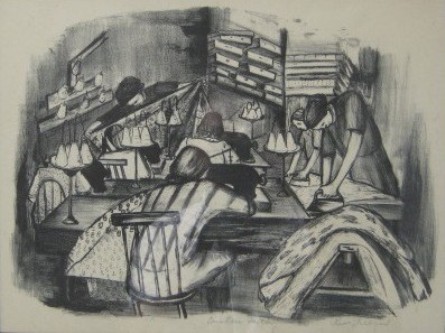 The Jewish artists in this show, all first- or second- generation immigrants from Eastern Europe, mostly worked as artists for the WPA (Roosevelt’s Works Progress Administration). But state-subsidized artists did not have easy lives. Artist Riva Helfond worked in hat and textile factories while studying at the Art Students League in New York before being hired by the WPA and establishing a printmaking program at the Harlem Art Center. Her painful memories of days of machine labor come through in “Curtain Factory,” where the women in a curtain workshop, all sharp angles and edges, resemble nothing more than prisoners.