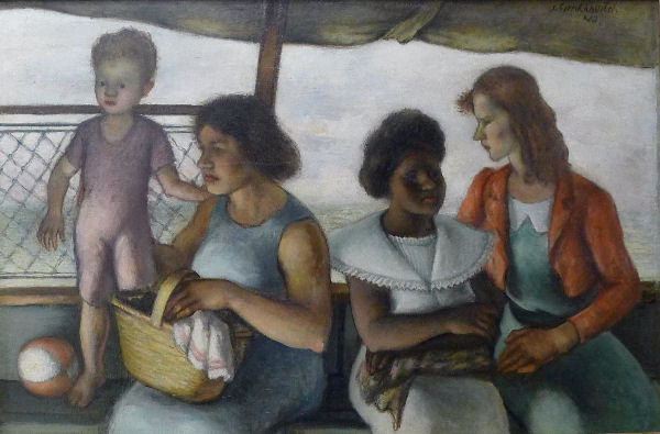 In “Island Beach Ferry,” a group of young women, each seemingly confined by a specific circumstance of concerns and fear, sits alongside each other on a ferry as a young American child smiles from a secret happiness at the viewer. Each woman represents a different ethnicity, and each aches from their own struggles of scraping together a living during the Depression — but somehow, they are making it. It’s worth nothing, however, that these artists, caught in their historical moment, had no idea that the Depression would end, or that the U.S. would go on to be more prosperous than ever. It’s easy to read these images retrospectively as hopeful depictions of people surviving a traumatic period, but perhaps more interesting and touching is the realization that these artists created images of hope without the certainty that these tough times would end.
