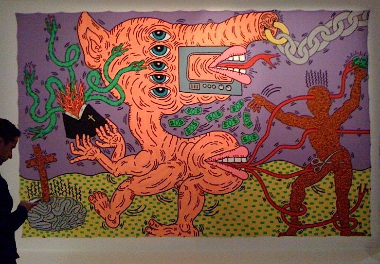 In his Untitled, 25 September 1985, (top image) his palette is rich in color and echos pop artists Valerio Adami and Patrick Caulfield. This and other works like it raised the bar for street and graffiti artists with a sure hand and a fluid and graphic surrealism that takes on religion, television and the violence of excess.