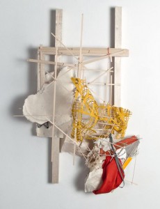 The wall-hung pieces are particularly promising. They have wooden armatures, regular lattices created from thinner, wooden sticks, and some have areas of the cell-like wire structures used in the tabletop work. Granwell adds various scavenged materials to these forms: bunched cloth, bits of wire, scraps of cut cardboard, torn and crumpled paper, plastic mesh. Many of these are brightly-colored, and her subtle arrangements of small amounts of intense color are a clear legacy of her painting. She combines the regularity of industrially-made materials with irregular forms that are not so much organic as distressed. They carry a history of prior use and obsolescence. The wall pieces employ angles that have the axiometric quality of Russian Constructivist art. It is striking that works cobbled-together of such irregular, cast-off materials appear so carefully-calibrated and balanced. They are elegant in their restraint.