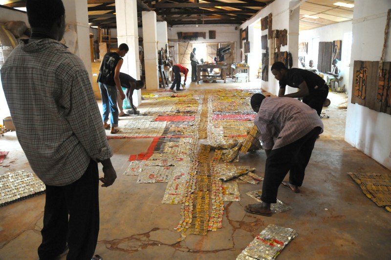 Anatsui spends two to three months testing various configurations of panels, his workers hauling pieces from one spot to another while Anatsui, pacing and scrutinizing the results from every angle, methodically issues orders. Anatsui does not sketch or plan his works beforehand, instead reconfiguring the vibrant panels on the floor of his workshop endlessly until he is completely satisfied with the result. This allows the pieces to develop more organically and let the artist remain continually engaged with the materials during construction. In Anatsui’s words, “drawings make you a slave [to your preconceived plans].”