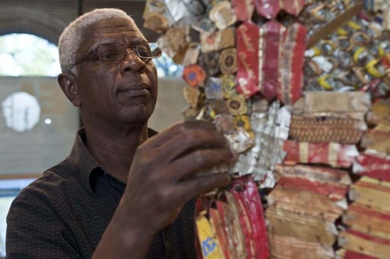 “Fold, Crumple, Crush” is a quiet, charming documentary directed by Susan Vogel examining the life and work of Ghanaian-Nigerian artist El Anatsui. The film begins at the 2007 Venice Biennial where Anatsui is overseeing the construction of an exhibit of his work. Vogel then follows Anatsui to his home in Nigeria, gaining insights into the artist and his art from his colleagues at the University of Nigeria, Nsukka, his assistants in his workshop, and from the man himself. Over the course of the film, we learn of Anatsui’s evolution as an artist, from paintings, to sculptures made from clay and great blocks and chainsawed wood, to his current medium, crushed bottle caps collected from distillers in Nsukka. We also come to know Anatsui as quietly intense, private, and modest yet exacting individual. Vogel is an unobtrusive presence throughout, interspersing shots of Anatsui’s work with talking-head interview segments.
