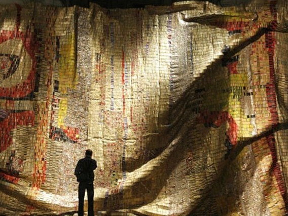At first glance, Anatsui’s vibrant tapestries crafted from re-purposed cultural detritus might seem like Pop Art, but the pieces do not possess the garish kitsch and unsubtle irony one might expect from that genre. Similarly, although one might be tempted to look at Anatsui’s medium and find in his art an implicit commentary on capitalism or consumerism, or even a pro-environmentalist agenda, in the artist’s mind his work is not engaged with the political in that way. Instead, Anatsui seems most interested in something subtler and, arguably, more profound: the idea that his current medium contains history within it.