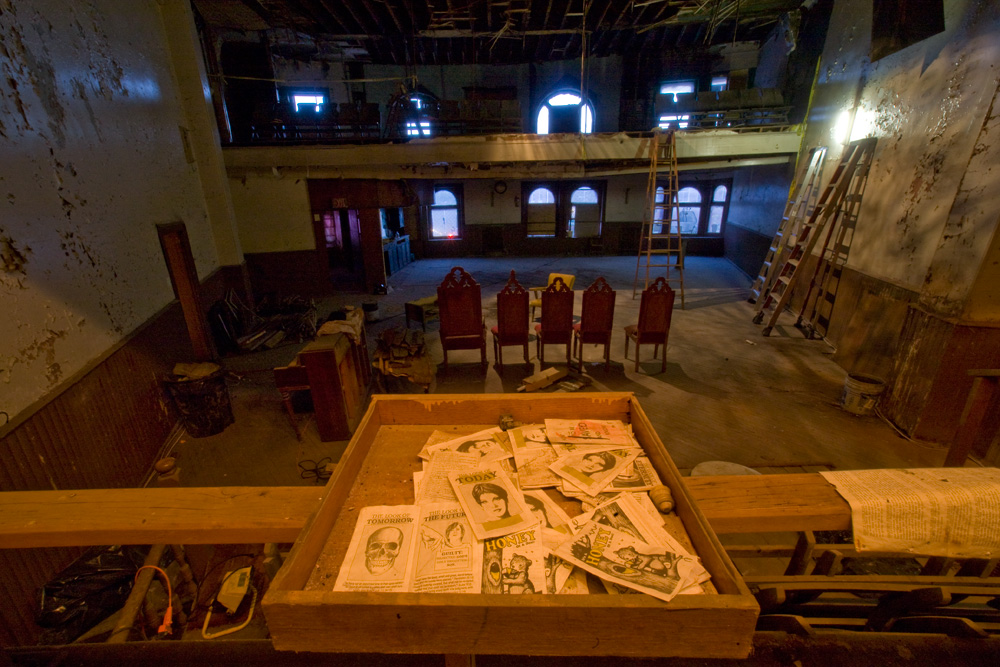 A major inspiration for Rabid Hands’ transformation of Hawthorne Hall is the rich history of the space. Built in 1895, the Hall has been home to dozens of organizations over the years. Notable groups that have inhabited – and thus altered, modified, and left their charge upon space – include the Irish National Foresters, New Light National Baptist Church, and the Knights of Pythias. Unique moldings suggest the space may have also been home to a cabaret theater at one point. Each of these former tenants added to the space, either physically altering it or imbuing it with new meaning by their presence and the rituals they enacted within it.