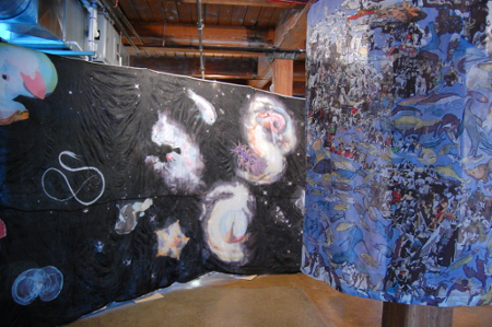 In a couple of larger-scale works, Erb sets out to spectacularly tackle art, history and nature. She recreates Picasso in “Guernica Revisited” where she combines the famous scene (as with all of her work here, on silk) with contemporary and late-20th Century figures, newspapers, and scenes of war that even the visionary Picasso could have scarcely imagined. She does the same with Hieronymous Bosch’s “The Garden of Earthly Delights” and also displays the visage of the almighty dollar, caustically titled “American Flag.” Her centerpiece – in both location and sheer scale – is “Geocentric Universe.” This massive, walk-in, circular curtain has a central fabric column dotted with all manner of human and animal presence. The exterior sheet, which rightfully dwarfs us land-dwellers, resembles the deep, dark ocean, or perhaps the vastness of outer space. Erb’s gigantic installation is a reminder to us all that, as humans, our only possible perspective is an Earth-centric one.