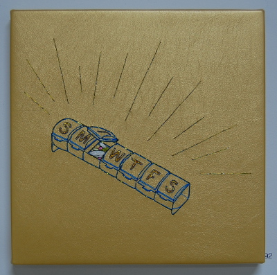 Of the three, the most abstract work belongs to Sabrina Small. Many of Small’s pieces are surreal watercolors that look like warped fetal forms or genetic experiments gone wrong. She adds a healthy dose of the nightmarish to a show that overwhelmingly pays heed to the Zeitgeist as opposed to the subconscious. Where she does venture into the realm of the recognizable, her art is right on par with both Erb’s and Marsella’s, however. One group of square gold vinyl canvases depicts common objects held to some quirky, deified new standard: a wheelchair, a birdcage, and a Sunday-through-Saturday pill organizer. Small cannot really help herself, and still manages to test the waters of the unreal by throwing in a character dressed in an animal costume, spewing energy from her third eye. Where this artist’s renderings are strange, they revel in their oddness; where they are obvious and realistic, they are still invariably bizarre.
