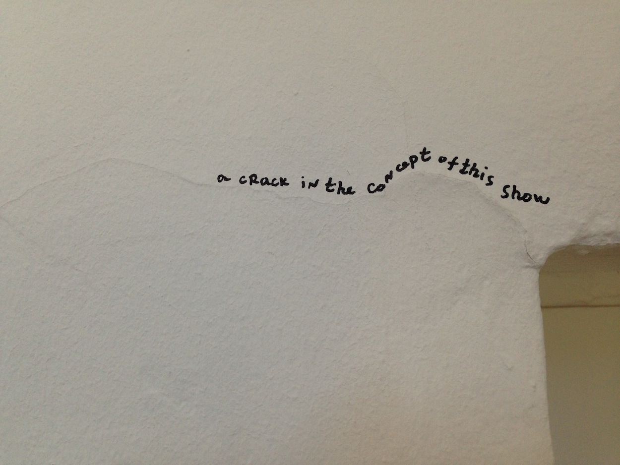 Without a permanent collection, the KW maintains a cultural environment in constant negotiation with the sociopolitical. Curator notes, leftover from a collaborative project between artist Nedko Solakov and Chief Curator Ellen Blumenstein, are sprinkled throughout the former margarine factory. A crack in the wall has the message “A crack in the concept of this show.” Two stick figures appear at various heights: “a curator in a strong position” and “a curator in a not so strong position.” The wit ascribes narrative to the KW’s building, a small reminder of the hands and thoughts of those the viewer rarely encounters.