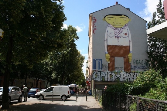 Also off the Moritzplatz and along Oranianstrasse you’ll encounter a young nightlife scene with Kebab stands, Mexican tequila joints, and traditional beer gardens. The large Turkish presence is clear in the street art, such as a wheatpaste of the now iconic Turkish student protester in a red dress being tear gassed.