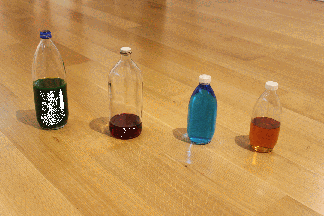 In the second gallery, a row of bottles glowing with colored fluids greets us, some vibrating with intensity while others remain muddier. One of Feher’s early bottle pieces, “Look See” is made with transmission and brake fluid, radiator coolant and Windex®, all dyed distinct colors for identifying purposes. Surprisingly intact, this work’s extreme light sensitivity led Feher to later favor water tinted with food dye, a more durable substance. Unfortunately, this excluded the original variation in opacity apparent here— while translucent water captures the play of light well, it cannot take on more impervious textures.