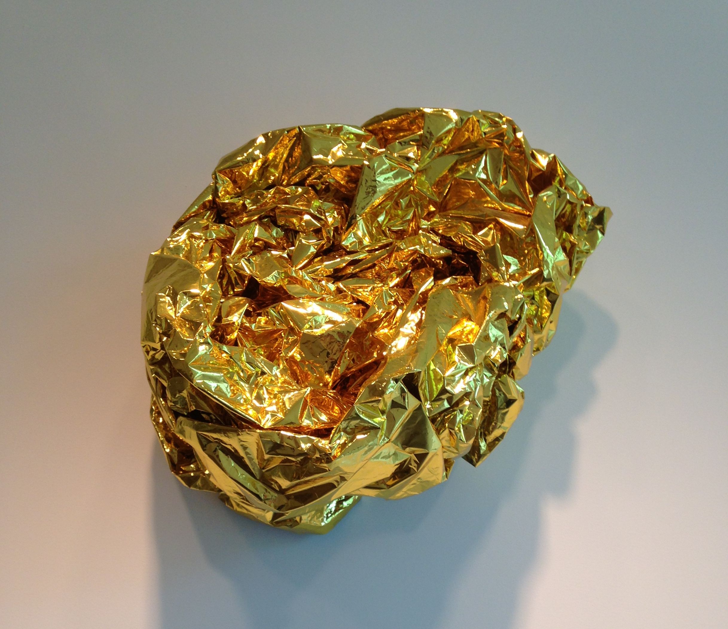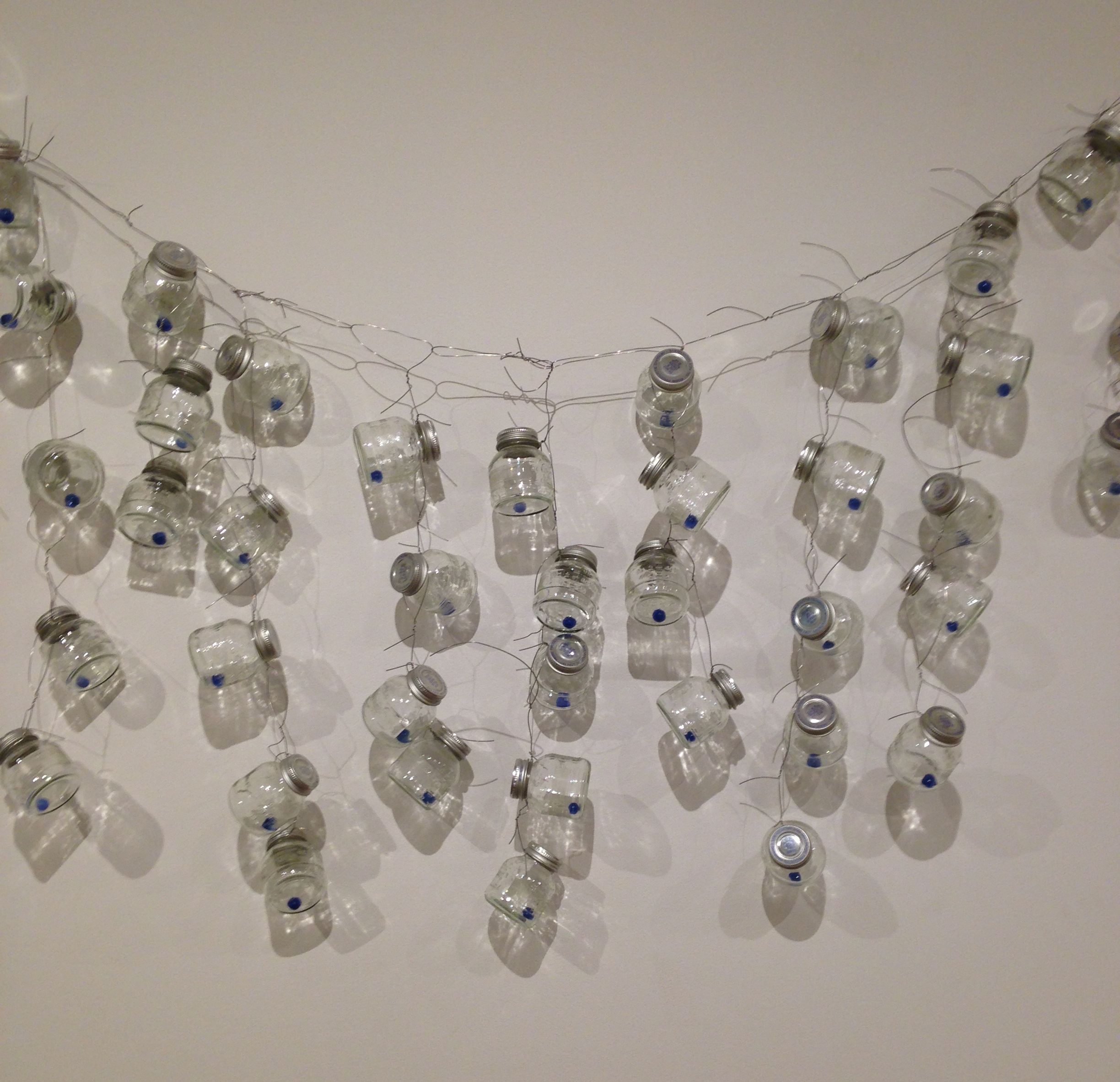 Other notable artworks in the show include “Untitled” (nicknamed “Nugget”), a shimmering golden Mylar blanket scrunched and held together by a binder clip, from which it hangs quite beautifully on the wall. For those who enter by the main staircase, this candy-like revelation will be their first glimpse of the show. “Until Tomorrow,” in the gallery next door, is a whimsical string of empty baby formula jars, each carrying a single marble. Reminiscent of the simplicity of post-minimalists like Richard Tuttle, this piece celebrates the splendor of modest, fastidiously-arranged forms.