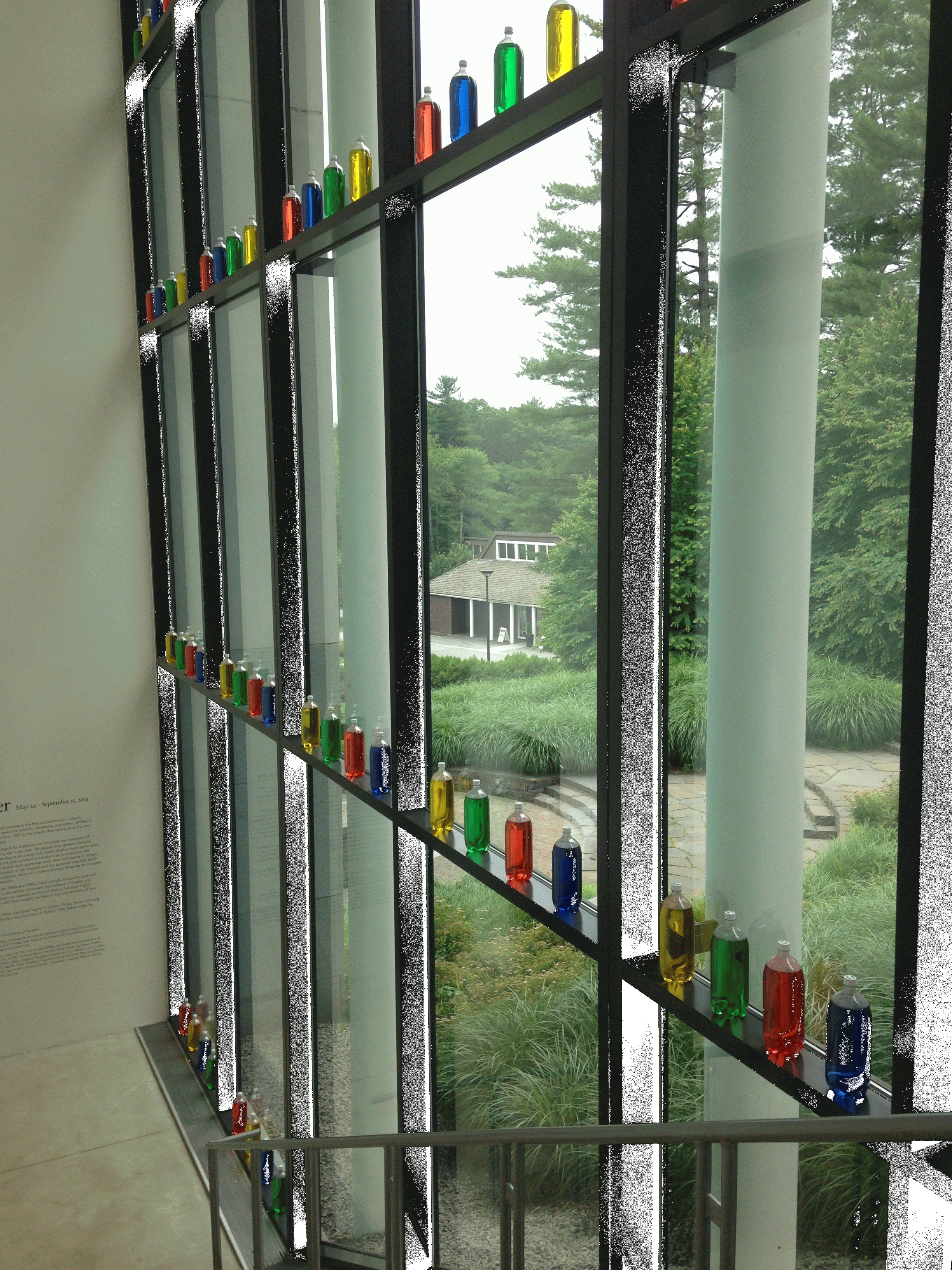 A more recent incarnation of Feher’s work with bottles, “Wishing Well Wishes Well” is a stunning, almost overwhelming proliferation of brightly-colored containers spanning the length of the deCordova’s three-story staircase. When the artist first visited the site, he identified this grand staircase, encased on one side by geometrically outlined windows, as the iconic architectural feature of the institution. As such, he chose to pursue one of his three site-specific installations there. Row upon row and column upon column of red, blue, yellow and green bottles flicker with sunshine, enveloping the building and transforming it into a brilliant stained glass vision. Obsessed with patterning, the artist made sure to alternate the sequence of colors so that no one column consisted of a single color.