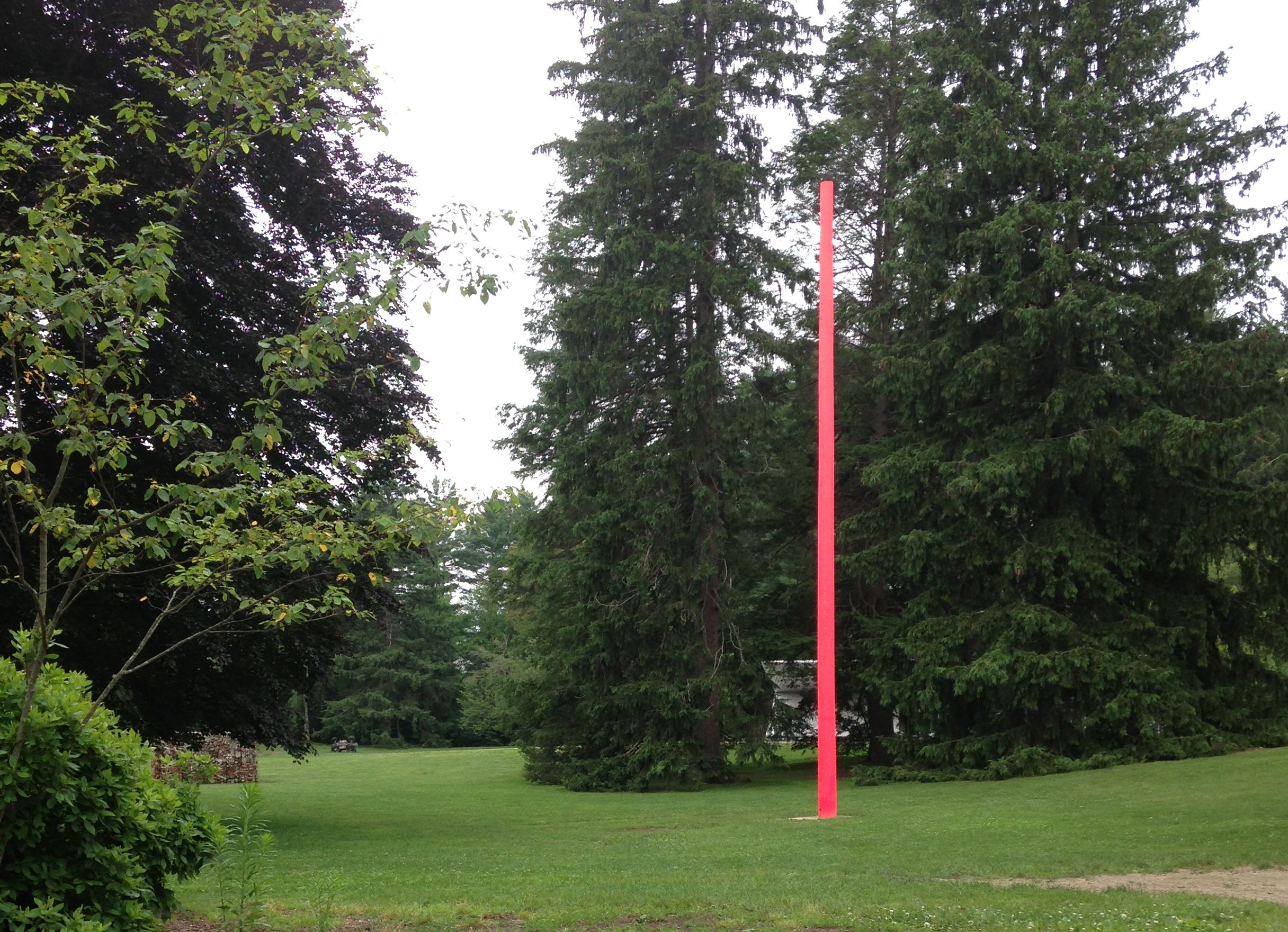 The play of light is also a fixation for Feher, whose outdoor site-specific piece, “The Nothing Before Something,” is a beacon of pulsating fluorescent pink shooting up toward the horizon. Painted DayGlo brand “Aurora Pink,” this work references Stephen Hawking’s theory of singularity— the moment of infinite collective energy before the explosion of the Big Bang. Particularly in the afternoon, the painted utility pole literally vibrates with neon intensity.