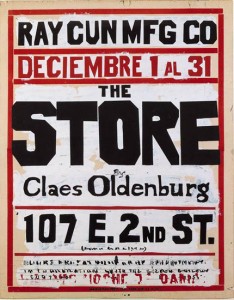 The catalog is extensively illustrated with Oldenburg’s photographs of downtown New York, reproductions of individual works, and period photos of works in the studio and early exhibitions, including an interesting sequence of the artist installing a gallery exhibition in 1962. The performances are also documented with numerous photographs. The designer, Joseph Logan, has done a superb job with a difficult task, creating a particularly handsome book about work that is raw, and not distorting it. He used blind-stamping on the cloth cover, full-page bleeds of environments, and sequential images from performances and films. Oldenburg’s manifesto that begins: I am for an art that is political-erotical-mystical, that does something other than sit on its ass in a museum. is printed on the inside of the dust jacket, giving it some of the eccentricity of the artist’s 1967 book, Store Days, where the complete manifesto was first published. That publication came with the business card of Oldenburg, as the store’s proprietor, in a small glassine envelope glued to the end-papers.