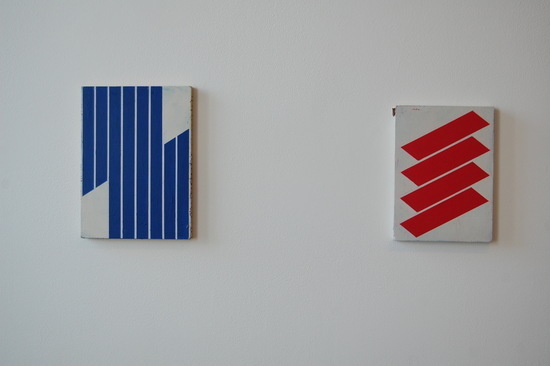 This use of detailed small spaces for explorations of play and color is also present in the works of Belgian artist Alain Biltereyst. His two geometric pieces, dwarfed by a swooping swath of orange paint from a work nearby, are edged into the corner of the gallery by the window, which cast an angular ray of light on them during my visit. They seem to fit into one another — one occupying the negative space that the other leaves behind – in an elegant and non-literal way. Looking closely, you notice that there is an element of ruggedness in their apparent austerity. In profile, the structure of the panel becomes clear, revealing a notched design of holes within the wood.
