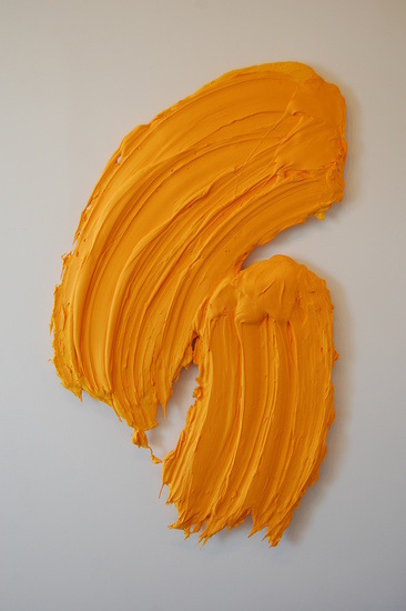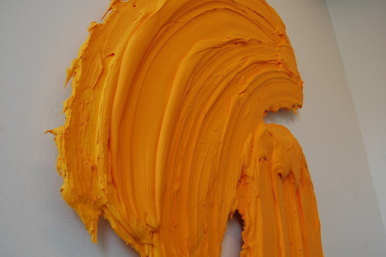 The largest and most eye-catching artwork in the show is a portrayal of the painting process, examined on a microscopic level. Yukpa by Donald Martiny breaks the boundary between painting and sculpture by depicting two projecting swathes of paint produced by a giant brush. On a canvas, this piece would impress viewers with its self-indulgence – just two brush-strokes of a single shade of yellow-orange. But in gigantic form, with every ridge and wave of the smeared paint’s texture visible, the work takes on the three-dimensional presence of an organism, physically crawling up the wall.