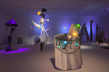Moving upstairs, you will be mesmerized by Geoffrey Farmer’s Let’s Make the Water Turn Black. The theatrical installation presents a collection of objects and sounds that reflect the life of Frank Zappa. An entire stage of choreographed objects is activated by light, movement, and forms, producing a sculptural concert that can be experienced from various angles. The work held me in place for nearly an hour, my eyes never tiring of hypnotically jumping from sound to light. This work-in-progress is one of the most memorable contemporary installations I have seen in years.