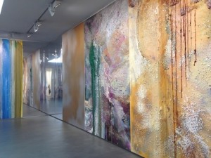 Near Mai 36 Gallerie along the Waldmannstrasse is Galerie Andrea Caratsch with an exhibition by contemporary Swiss artist John Armleder on view through September 27. The exhibition begins with three mirrored planes, each presenting miniature collaged mirrors cut into geometric shapes and glued down into a horizontal whole. The pieces create their own reflective symmetry, grabbing hold of the gallery’s shapes, colors, and light. After being transfixed by this minimalist simplicity, the viewer enters a large square room covered floor to ceiling in glitter-splattered foil. One part five-year-old’s birthday party and one part expressionist abstraction, Overload is overwhelming and magical at the same time. As a whole, the exhibit’s flamboyant and simplistic dualities of mirrored self-perceptions create a thought-provoking metaphor for the alternating chaos and tranquility of contemporary life. [Armleder showed at ICA in 2006, where, one evening, he and Christian Marclay performed a Fluxus-inspired sound performance that was merry and child-like. Read the artblog post.–Ed.]
