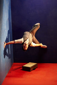 Soon, the man forgets all about whatever he was waiting for, and begins to explore his tiny altered universe. In a long, fluid musical and physical montage reminiscent of everything from clowning and break-dancing to ballet and a rock concert, the man tests his new-found ability to walk right up the wall—as it appears in the ingenious live projection.