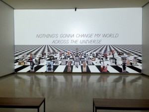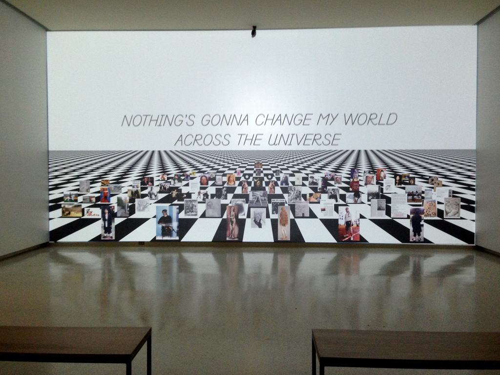 We are intrigued by Frances Stark’s hip-hop poetry-slam video installation with its celebrity chessboard and scrolling-billboard rant. The percussive urgency and the hint of a narrative are visceral. But a confusing and slippery mixed message leaves us wondering amidst the mish-mash of quotations, who was really speaking and if it was Frances Stark, just what is she saying? The taste we got gave us an interest in what comes next. And, give-away alert: Stark produced five broadsheet posters that continue her poetry slam into the world of paper and ink.