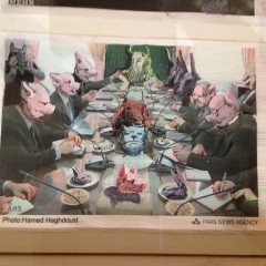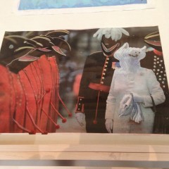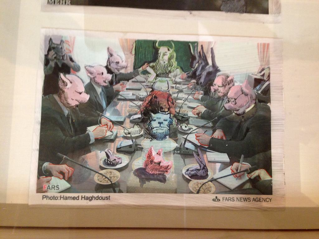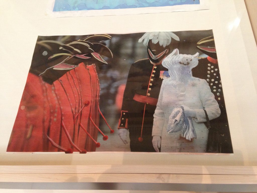 Rokni Haerizadeh (Iran) is our pick for best of show. We like Haerizadeh’s human-bestiary commentary on the horrors of violence and on the folly of hierarchies. It’s a medieval approach to the reversion of the culture to medieval. Topical and eternal all at once, Haerizadeh’s troop transport vehicle is a yawning lion, maw stretched open to eat up the soldiers. Bird-headed villains beat up and eat up their enemy prey. Haerizadeh’s gorgeous handling of gouache over printed matter (newspaper photos of chaotic political street actions) creates a Hieronymus Boschian agitation. Animated animal imagery painted over video of the wedding of Kate Middleton to Wills into a sub-human comedy of vanities.