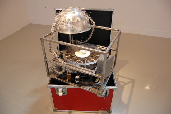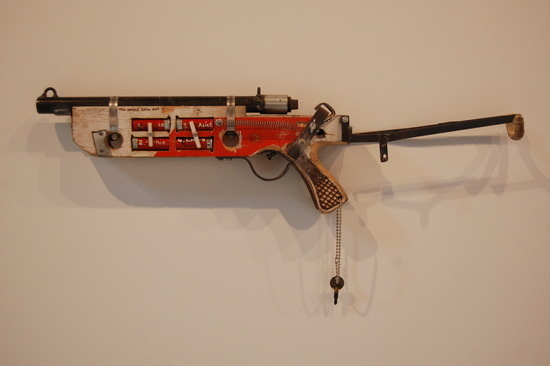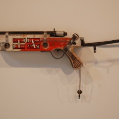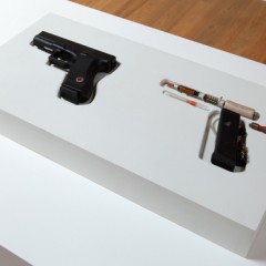 Continuing the exploration of questions about the nature of danger and the threat of violence is Gregory Green’s decidedly unsettling, non-functional 10-kiloton nuclear explosive that only lacks the plutonium needed for a detonation. Instead, a baseball sits at the center of the device. Created in 2000, Green’s piece was built based on plans he found on the internet. The bomb is dissected and left in pieces, exposed to the viewer, so that the inner workings are visible, while the entire piece can be imagined being put back together as a functional device. Everything would fit inside the red case, and if it was closed up, the package would look less suspicious than Skreber’s “suspicious package.”