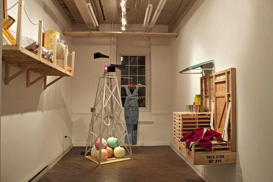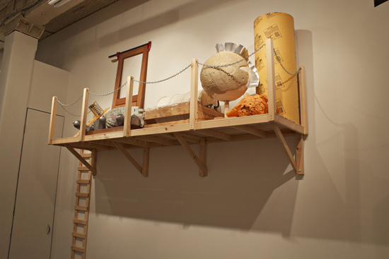 The third component, “The Loft (A Year’s Unfinished Thoughts),” is filled with leftover items from Colburn’s studio that speak to the other two pieces in this installation. While the visibility of these objects is somewhat obstructed by their placement up high on the wall, the objects look like works in progress, including an unfinished moon and more molded vegetables.