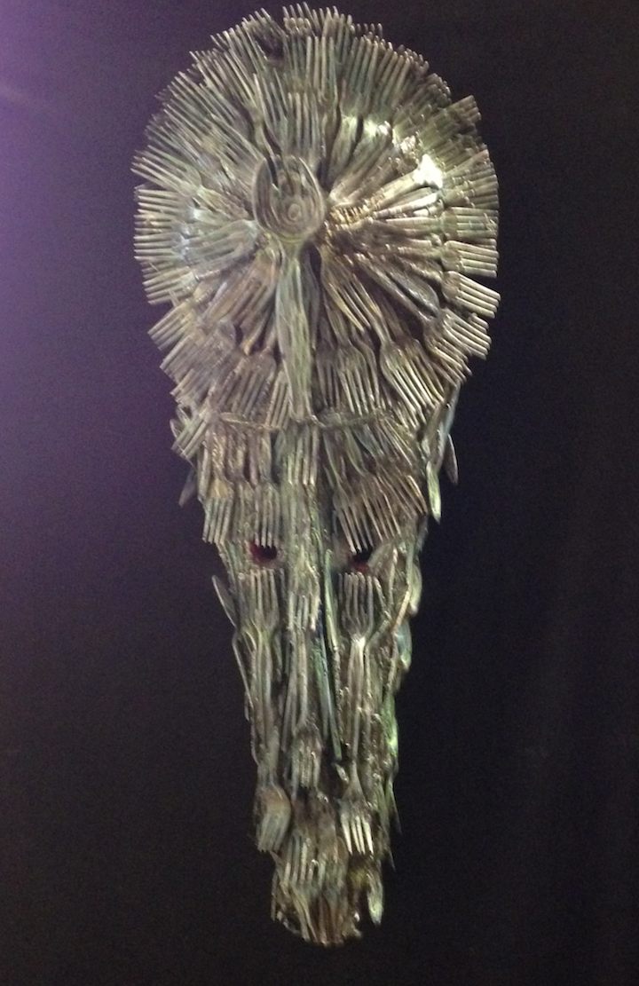 With the cost of moving to the West Coast and rehabbing the house, Rhodes turned to making masks of the free plastic utensils from take-out meals. He writes on his web page at ArtSpan, the San Francisco equivalent of POST: