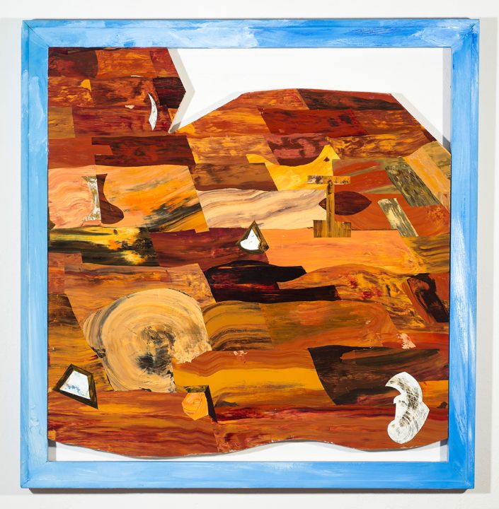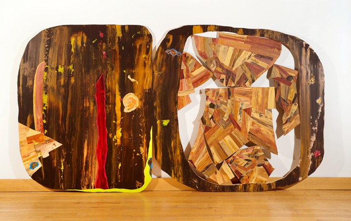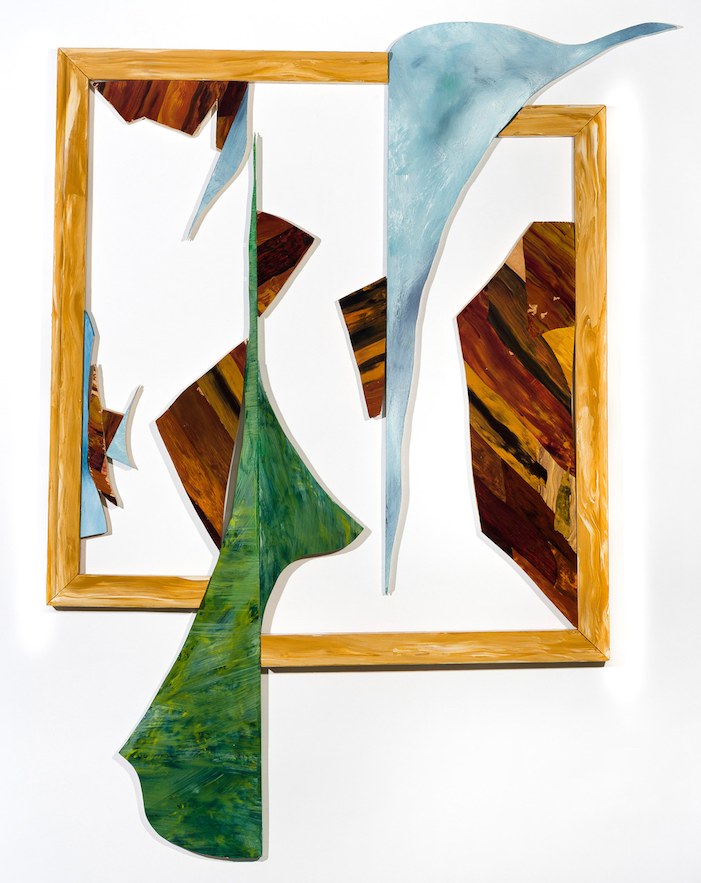 His signature, trompe l’oeil, wood-grain paintings on panel get the puzzle treatment here: He’s cut up wood panels in various sizes and shapes, and some of them seem to fit together like puzzle pieces. The artist has jiggered the fragments into uneasy relationships with standard-looking painting frames, where they mostly break the frames and create an atmosphere of comfortable discomfort. The suggestion is of a world not able to be contained within a structure, or perhaps a structure too inflexible to contain the galaxy that roils within.
