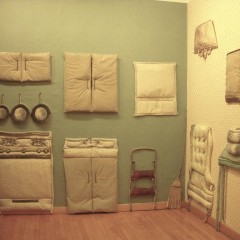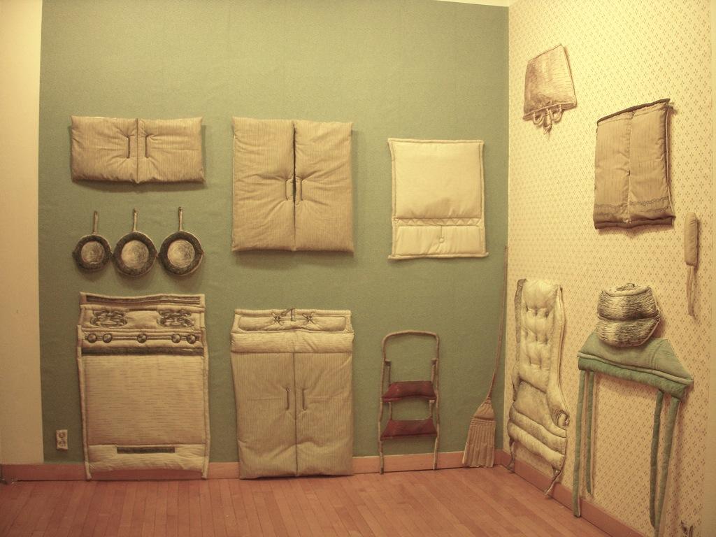 Healy’s stitchery is a marvel to look at. And in an Age of Ikea, whose showrooms are fantasies to dream on, Healy’s room arrangements, so life-like, so deadpan, are a jolt of reality as lived by most people everywhere (old furniture; a step stool and broom in the kitchen).