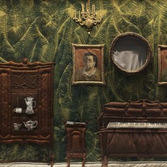 There’s something static in Healy’s works which seem like stage sets ready to be put to use in a drama. (I kept thinking Wes Anderson thoughts when gazing at them.) The works exude longing for the past but also a resignation with the passage of time. Healy’s open house is not a party but a wake.