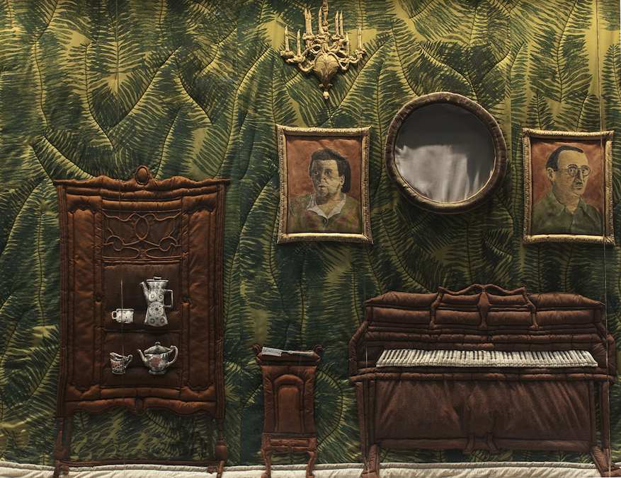 If Gerwin’s pieces exude comfort with the messiness of life or at least with life as balanced between chaos and order, Kay Healy’s stitched, relief memory room-scapes, built from stories told her by many people, are orderly, elegiac and mournful.