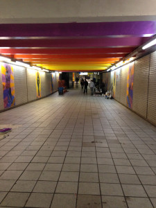 On the way home from that walk-through, I bumped into artist Phillip Adams. It was dark out, but there he was, painting a sunrise on the oppressive cast-concrete ceiling leading to the 15th Street Subway-Surface car station–the colors themed to the portraits he painted that have hung in that corridor for a number of years. Hey, I thought it looked great–and really did make a difference!