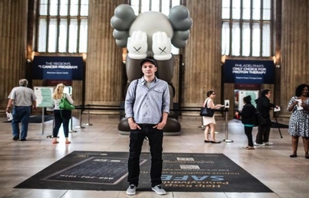 KAWS (or Brian Donnelly, his given name) was born in Jersey City, NJ, and received his BFA from the School of Visual Arts in New York. Recently, he has been in the spotlight for a number of reasons. One, he reinvented the MTV Video Music award (the Moonman statuette) and additionally created a 60-foot inflatable KAWS Moonman for the stage at the awards ceremony last August. Furthermore, last October, at 30th Street Station in Philadelphia, he installed one of his COMPANION (PASSING THROUGH) sculptures, a temporary project sponsored by PAFA.