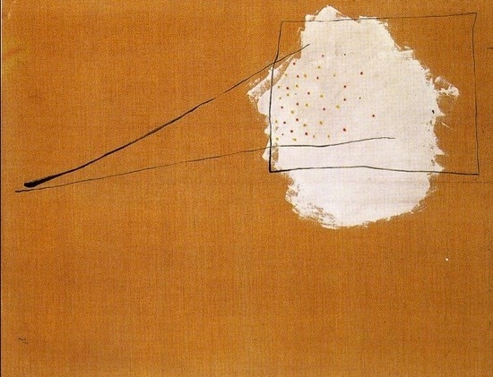 Miro also used hand-prints, painted on copper plates and sandpaper, and left un-primed canvas visible as part of his compositions. One of my very favorites, above and also in the exhibition, is “Untitled Painting” of 1927; Miro’s schematic of the relationship between vision and painting; the background is raw canvas, neither primed nor painted. Miro went one step further than Cezanne, and following him, Matisse, in treating a canvas support like a large sheet of paper.