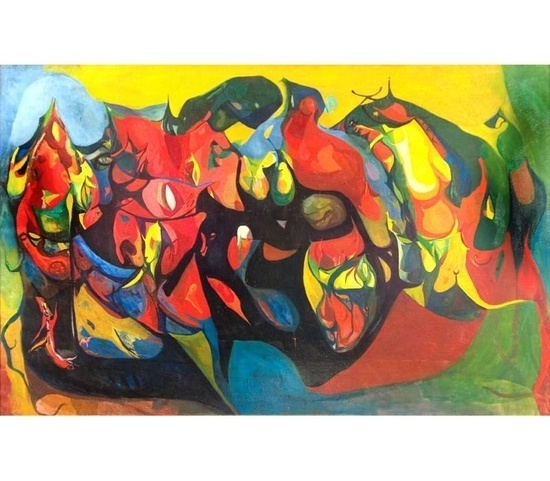 Other examples of interesting paint application include Max Ernst’s dragging a palette knife over canvas placed on top of a textured object (a sort of rubbing he termed grattage; both Ernst and Esteban Francis apply paint of different texture to different objects, to give the impression of collage); scribbled sgraffito and other unconventional paintwork by Enrico Donati; and a painting by Charles Seliger, whose technique I can’t quite figure out–the paint resembles enamel, and it might have been applied with stencils.