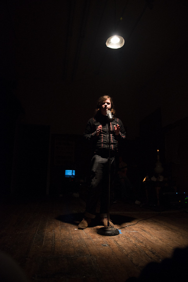 I found the performance to be very accessible while maintaining a level of depth. Josh Beaver, the storyteller, captivated the audience with his stage presence and authenticity. The performance truly embodied contemporary art and the post-medium condition. The well-composed set featured an elevated, enclosed cage where musicians from Philadelphia’s Space Whale Orchestra played during the show. Beaver stood in the center and told his story. Behind him sat a classic, big, old, decrepit West Philadelphia house made from cardboard. What I perceived to be the interior of the house could be seen behind Beaver, where another musician sat and played during the performance. Beaver told his story and the space around him illuminated imagery that acted as a visual companion for his words. The story was simple yet complex, difficult to hear, but easy to listen to, and quite seductive.