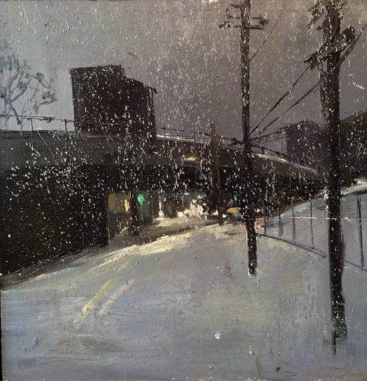 Gregory Prestegord’s paintings will resonate with anyone who experienced the past winter in Philadelphia. He captures the heaviness of snow’s blanketing, the loneliness in the streets as the city’s inhabitants remain forced inside; the endlessness; the constant.