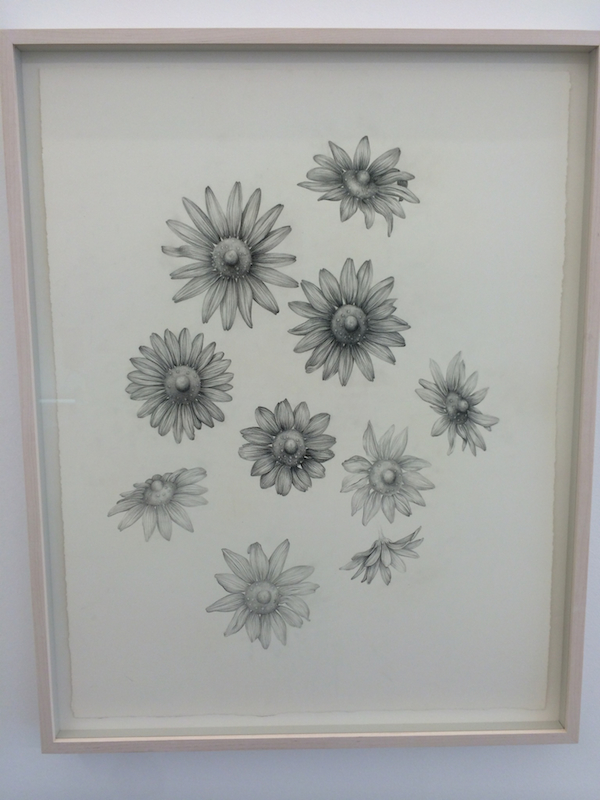 Aurel Schmidt’s intricately detailed drawings, while strictly gray-scale, offset the perpetual darkness of Molinier’s portraits. Her meticulous pencil work combines plant life with human sexual organs, most notably in “Untitled (Nipple Flowers),” a new work that depicts flowers resembling daisies with nipples at their centers.