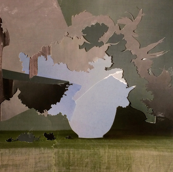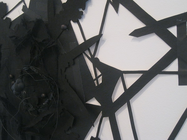 The work explores a variety of media, from sculptural drawings to collage. Upon the viewer’s entrance, the left wall of the gallery houses the latter. Created with found paper (mainly black-and-white advertisements from the 1920s) Landau’s collages display a unique, Escher-like interpretation of space. The tumbling compositions of the collages immediately distort perception; paper-cut forms that appear to rest in the foreground are overlapped by what appears at first to be a negative space.