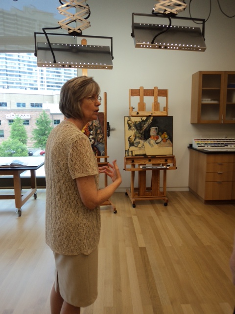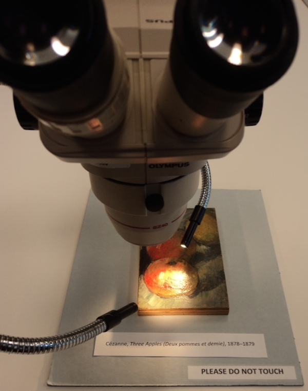 The microscope’s lens was focused on a small painting titled “Three Apples,” 1878-1879, temporarily removed from its usual location in a Barnes wall ensemble in gallery three, and available for study at a press event in support of The World Is an Apple: The Still Lifes of Paul Cézanne. This special exhibition opened at the Barnes on June 22.