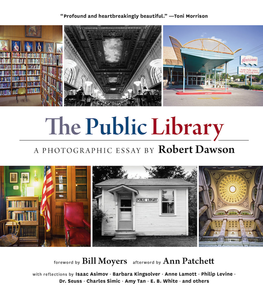 The Public Library: A Photographic Essay by Robert Dawson, Foreword by Bill Moyers, Afterword by Ann Patchett: Princeton Architectural Press, New York, 2014 ISBN 9781616892173, Publication date 03/15/2014, 8″ x 9″ (20.3 x 22.9 cm), Hardcover 192 pages, 100 color illustrations, 75 b/w illustrations
