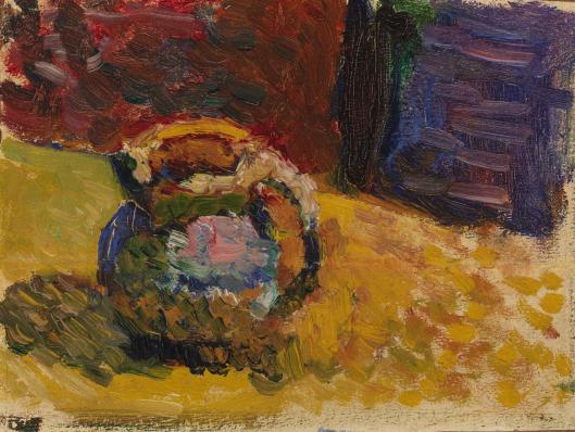 While the Barnes Foundation paintings, contrary to much myth, had received conservation treatment from the time Barnes acquired them, and sometimes prior to that, the conservation records only date to the 1980s. We were able to look at three Matisses that had been removed from the walls and taken out of their frames. “Small Jar” is a very small painting–5 3/8″ x 7 3/16″–on paper that had been affixed to board. It retained evidence of the paper having been folded, in the form of a horizontal line, slightly below the middle of the support.
