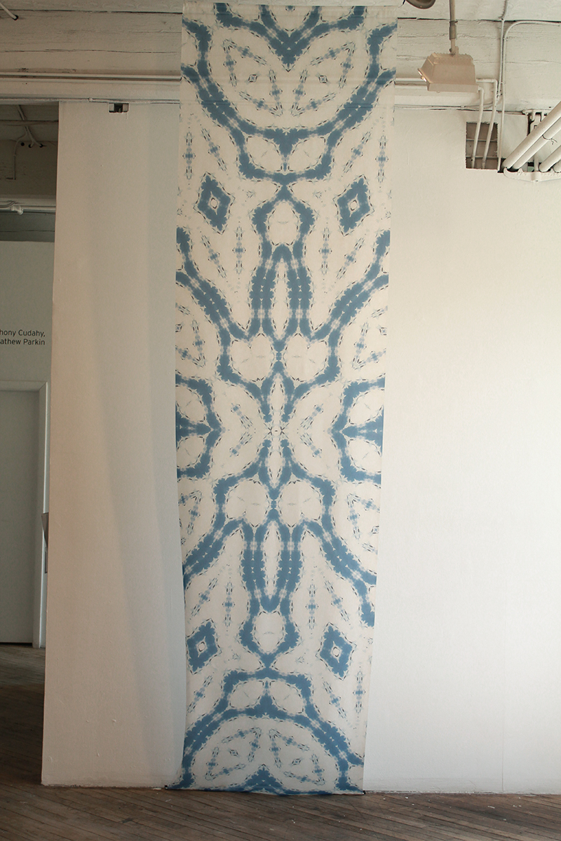 Sanaz Mazinani’s “Gripen in Flight” hangs monumentally and authoritatively on the far wall of the space. Resembling a cyanotype, but in fact a digital print on silk, the hanging shows what seems to be a highly magnified image of cell structure or organic material, similar to Anna Atkins’ archival cyanotypes of plant life in the 19th century. A fusion of organic imagery and synthetic process, “Gripen in Flight” is a nicely wrapped example of the blurred lines between times and techniques in this exhibition.