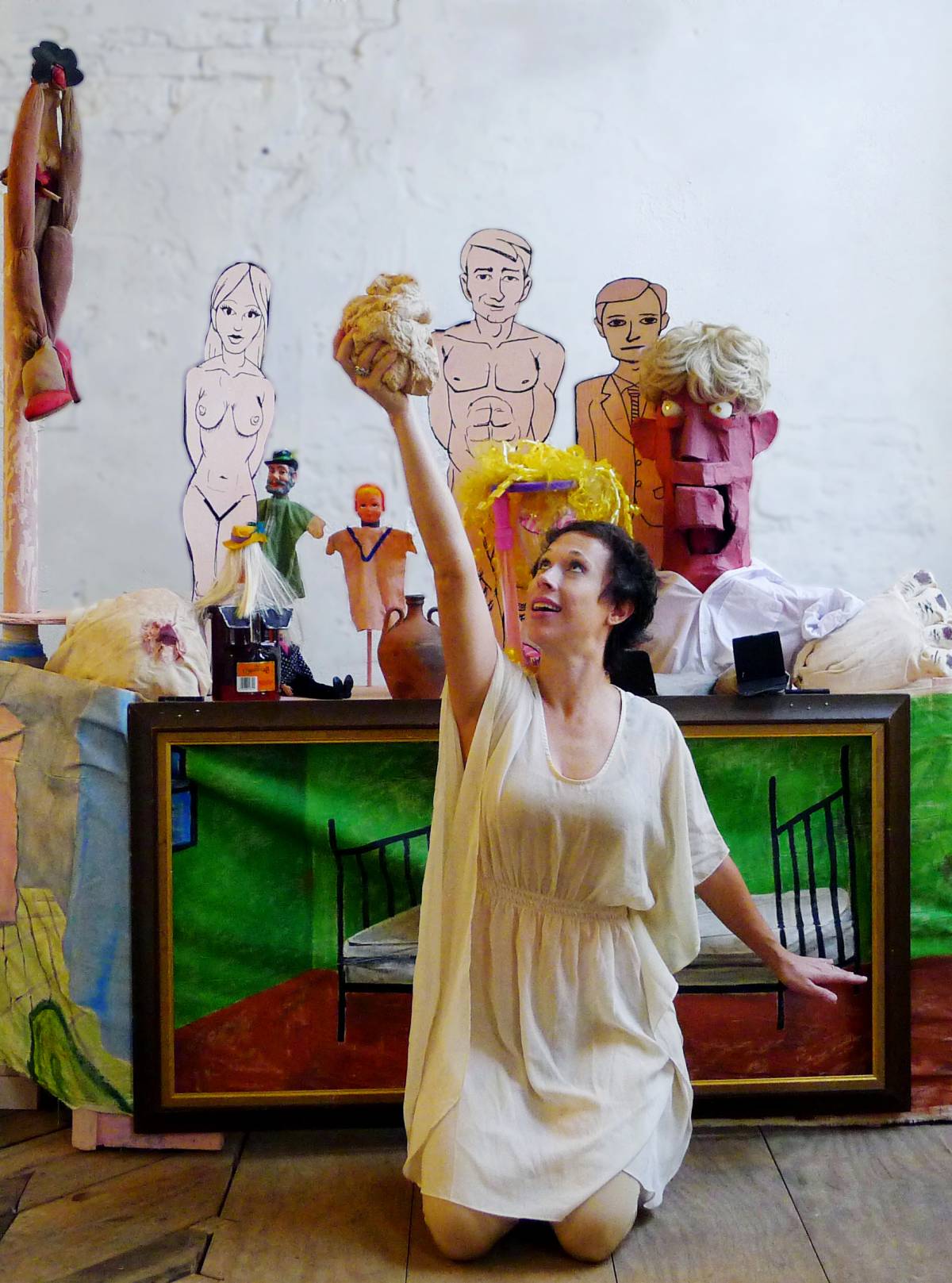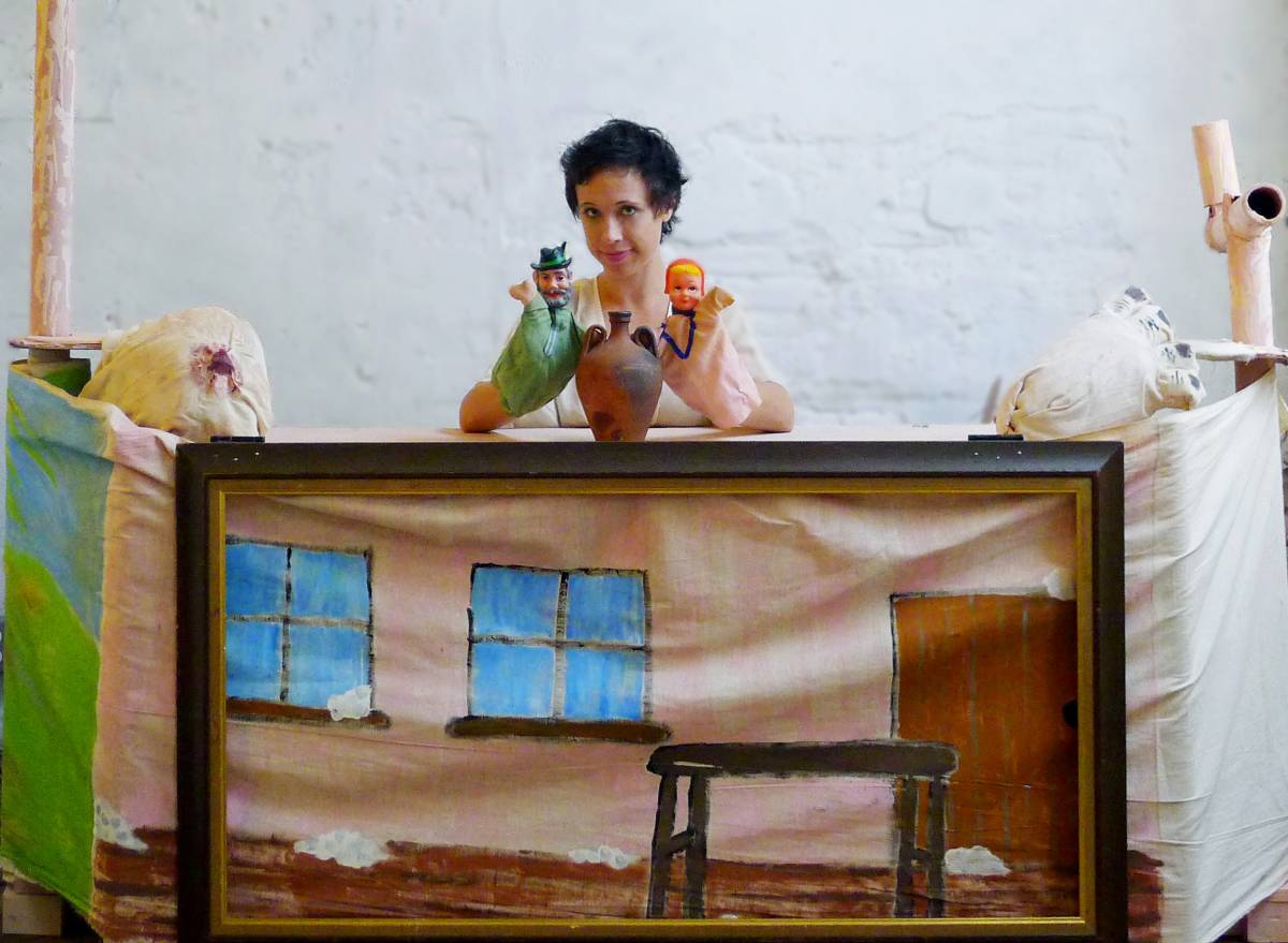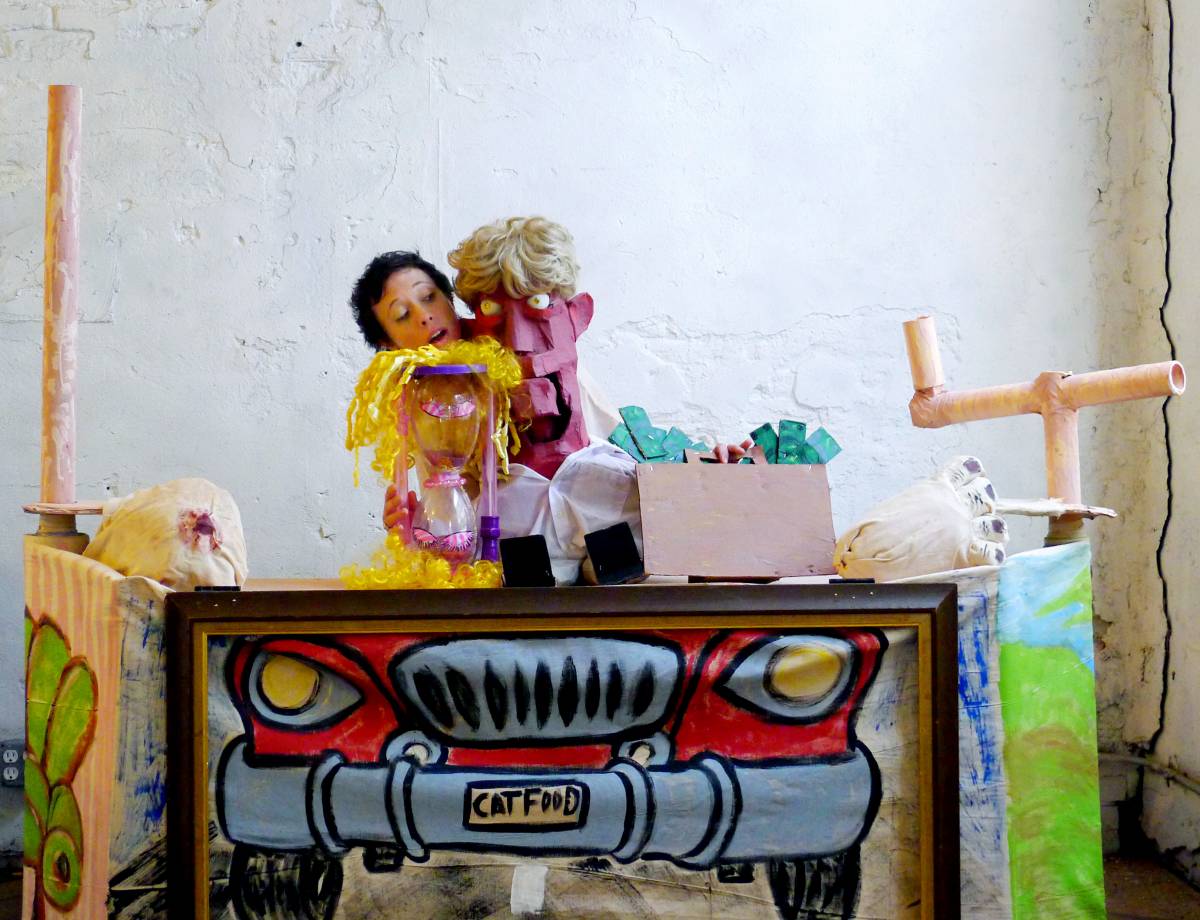 Founder of Transitions Theatre, Kennedy adapted the puppet play from her handmade 90-page book about the adventures of Jug-Baby and created the stage set with chicken wire, cardboard, and a roll of painted sheets, which change the backdrop. She fashioned the puppets from found objects.