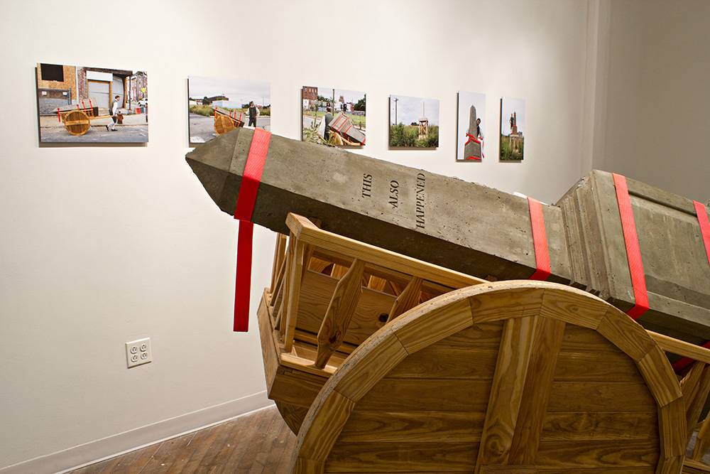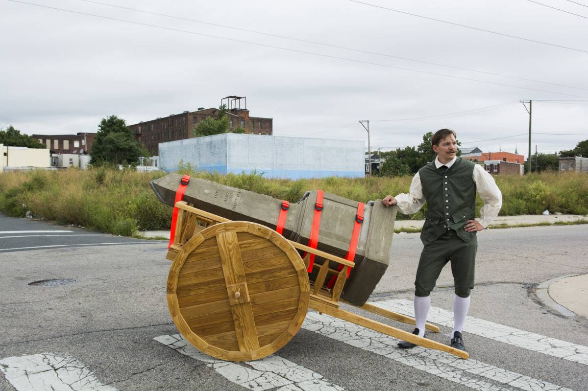 Colburn’s work overtly references the past, from the sculptures’ material to the period costume seen in the photographs. The largest sculpture in On This Site, a cement-cast obelisk laid on the bed of a wooden wagon, reflects Egyptian Revival architecture, favored in American architecture of the 18th and 19th centuries.