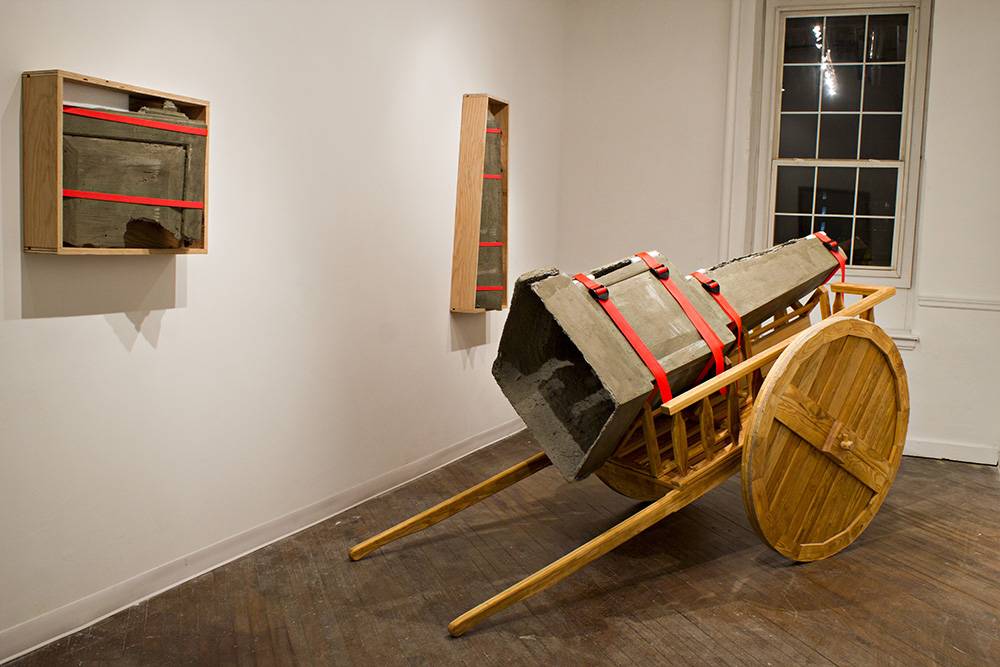 The exhibition, now installed in NAPOLEON’s narrow space, features a series of sculptures and photography. Two smaller objects hang on the wall to the viewer’s left; fragments of cement encased in a plywood crate, supported by Styrofoam pads. The third and largest rests ominously in the center of the space. The arrangement is tight–visitors must crowd and squeeze themselves between the enormous floor sculpture and the wall-mounted pieces. Nonetheless, the intentional monumentality of the centerpiece is amplified by the constricted space.